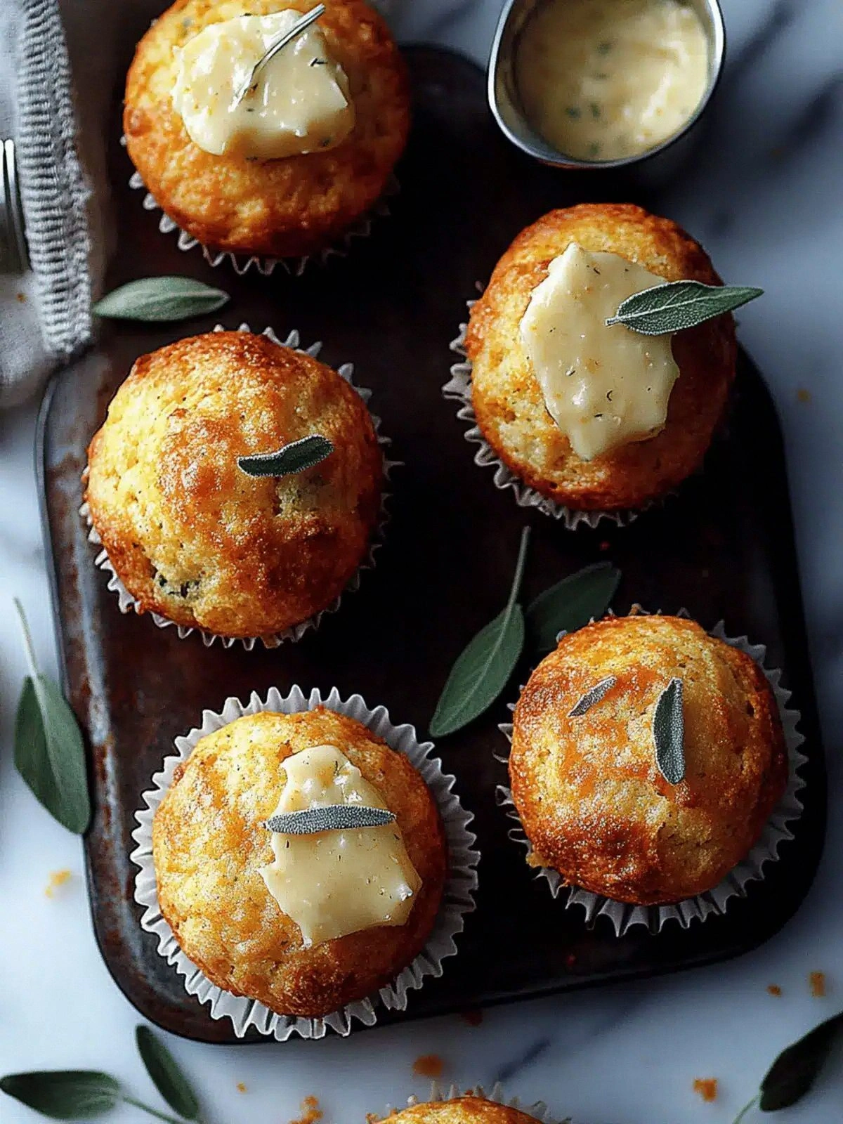 - Remove the muffins from the oven and let them cool in the tin for 5 minutes, then transfer them to a wire rack to cool completely. Drizzle the sage‑maple butter glaze over the warm muffins for an extra burst of flavor. The glaze adds a glossy sheen and a savory sweetness that completes the experience.