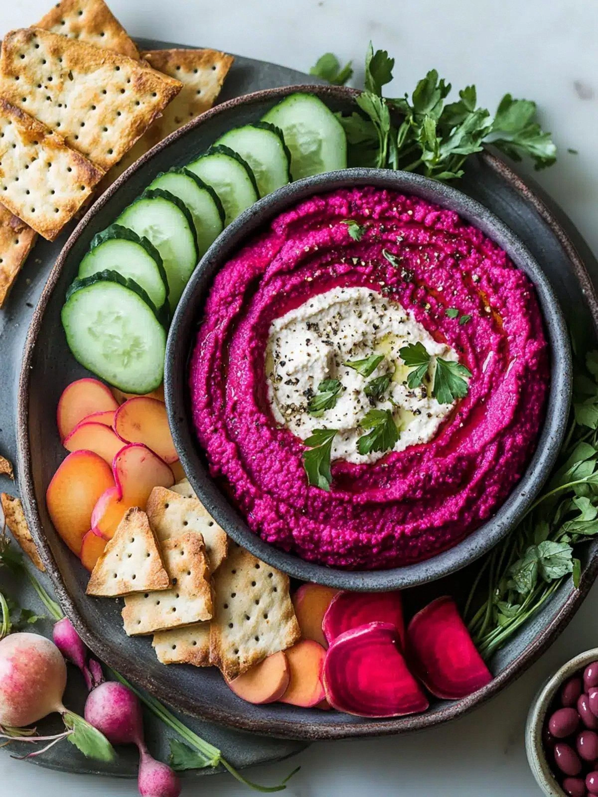 Fresh herbs like parsley or cilantro add brightness and a burst of color to the finished dish. A pinch of smoked paprika or cayenne pepper introduces a subtle heat that balances the beet’s sweetness. When plating, drizzle a small amount of extra virgin olive oil over the hummus; this not only enhances flavor but also gives the dip a glossy, inviting look. If you’re serving this at a party, arrange the veggies and pita chips in a circular pattern to create an interactive, self‑service style.