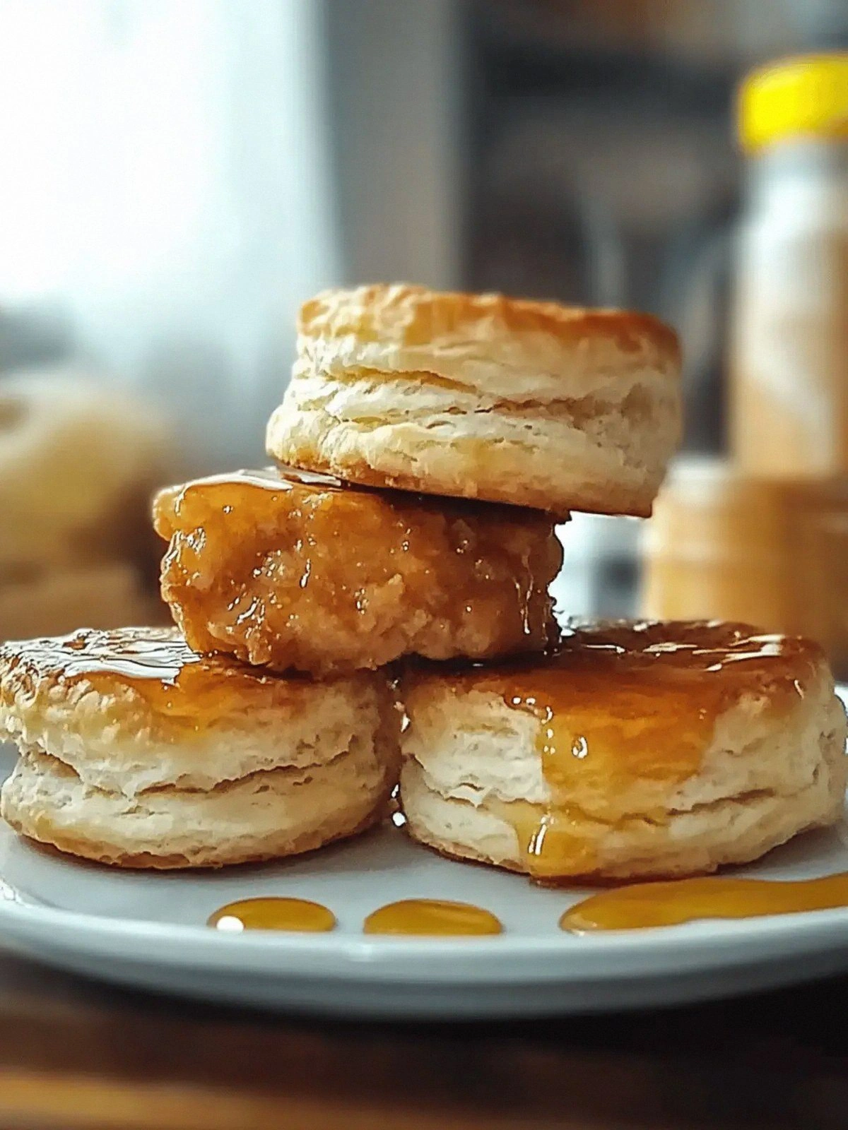 - Slice the chicken into bite‑sized pieces. Place a biscuit on each plate and top with the sliced chicken. Drizzle the remaining 1/4 cup of hot honey and a spoonful of extra hot honey (1/4 cup) over the top. The extra honey adds a glossy finish that looks as good as it tastes.